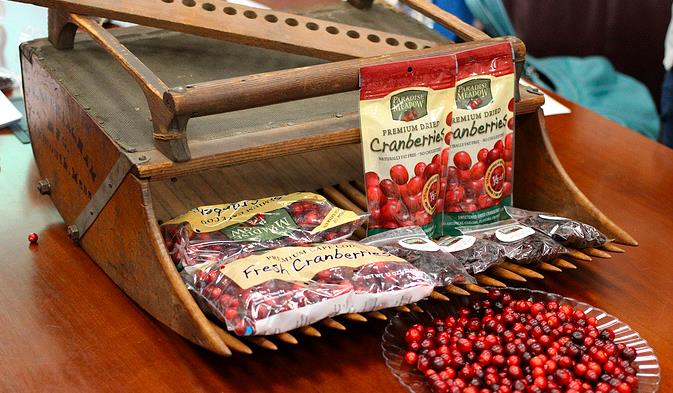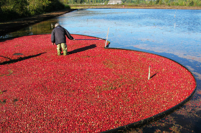 蔓越莓的收获从10月开始,为期一个月。农民有时等到果实变成深红才收获,因为果实越成熟,果汁越多,味道越醇厚。在收获湿种的蔓越莓的前一天晚上,它们都被淹没在一片汪洋中。