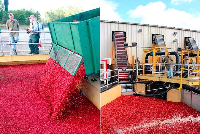 随后蔓越莓进行装箱前的冲洗步骤,经过传送带最后落在货车车厢里,被运往世界各地进行销售。就这样一片红色的海洋随之消失,最后变成了人们餐桌前的美味佳肴。