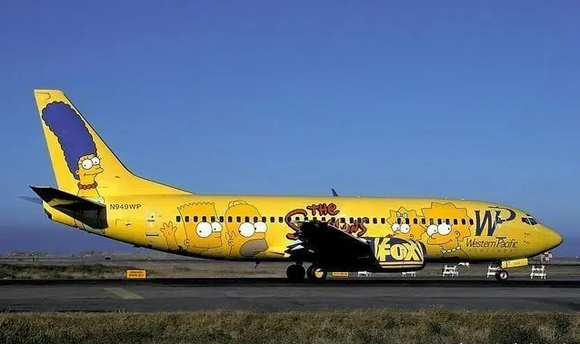 90年代初,现已解散的西太平洋航空公司允许其中一架波音737-300飞机用于福克斯电视台的广告活动。电视网选择了卡通明星辛普森一家装饰飞机的一侧。Mum Marge占据了飞机的后部,因为尾巴是唯一一个足以容纳她巨大头发的地方。