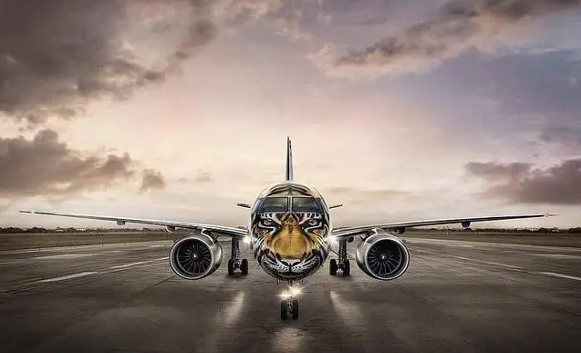 巴西航空工业公司还为它的E190-E2喷气式飞机涂上了令人惊叹的老虎头。老虎的脸覆盖了飞机的机头。