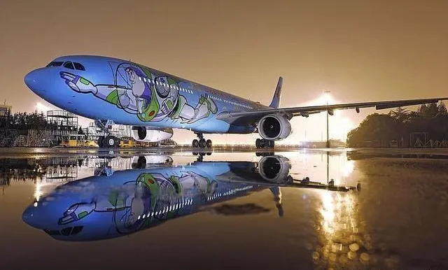中国东方航空公司给了乘客乘坐玩具总动员主题飞机与巴斯光年一起飞行的机会。外观上有一幅巨大的壁画,包括玩具总动员里Buzz和Woody等最著名的角色。这架飞机负责飞北京和上海之间的航线,以纪念2018年上海迪士尼度假区新设的玩具总动员主题区的开幕。