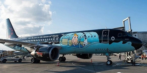 卡通人物一直是飞机彩绘的热门主题,布鲁塞尔航空的这架“丁丁历险记”主题飞机就是为了纪念这位比利时著名的漫画人物。飞机的外形是一艘鲨鱼潜艇,取自《丁丁历险记·红色拉克姆的宝藏》,上面还有丁丁和狗狗白雪的彩绘形象。乘客还能在飞机上阅读英语、法语、荷兰语三个版本的《丁丁历险记》。