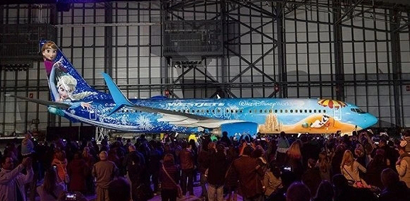如果你想要在飞机上画安娜、艾尔莎和奥拉夫等《冰雪奇缘》的人物,你将需要170加仑、23种不同颜色的颜料。加拿大的西捷航空就和迪士尼合作,请来了美国、加拿大、德国等国的画家,完成了这个壮举。而且“冰雪奇缘”的主题不仅体现在机舱外,也蔓延到了机舱内部。人们头顶的舱内装饰从机身后部的冷色调过渡到机身前部的暖色调。