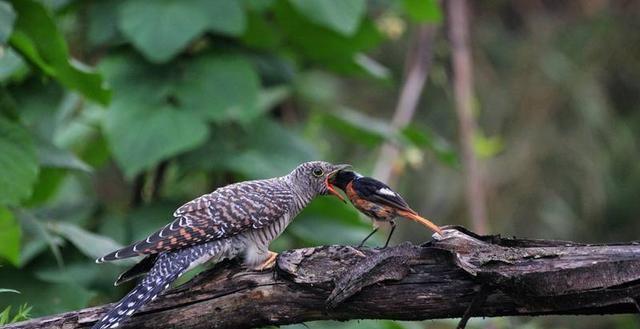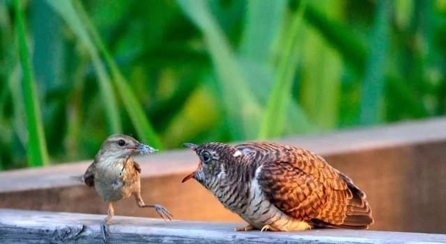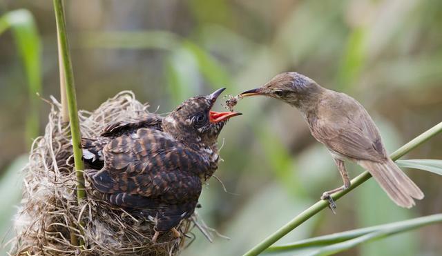 在自然界中有超过10000多种鸟类,大多数的鸟类都是自己营巢照顾后代的,但是偏偏就有那么80多种鸟类剑走偏锋,它们不但不自己营巢,还会将卵产在其他鸟类的巢里,让其他的鸟帮助自己孵化和育雏。其中,最具代表性的就是大杜鹃(俗称布谷鸟)了。布谷鸟古人称之为鸠,而它正是“鸠占鹊巢”中的“鸠”,而其中的“鹊”大都是比布谷鸟小的鸟类,那么,布谷鸟是如何骗过这些鸟类,让它们心甘情愿的为自己养育后代的呢?下面,我们详细地来说一下。(成年芦苇莺在照顾自己的“孩子”-布谷鸟雏鸟)