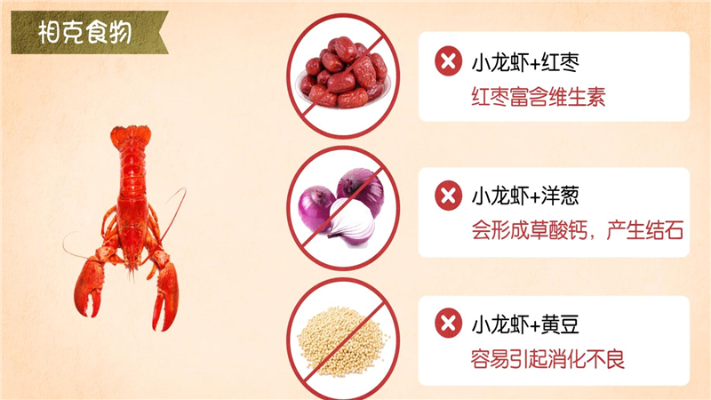 小龙虾不宜和红枣一起吃,红枣富含维生素,能将虾中的五氧化二砷转化为砒霜;