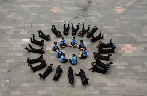 此类对环境要求比较高,需要台阶,可以选择在图书馆前、塑胶操场的观众台等地;可以摆一些常见的图形,如五角星、“四个圈”等。