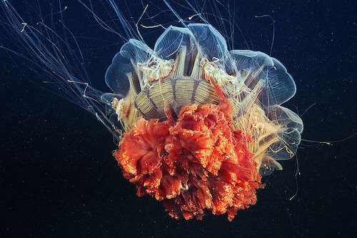 水母(英文名称:Jelly Fish):是水生环境中重要的浮游生物,属于刺丝胞动物钵水母纲。水母是一种非常漂亮的水生动物。它的身体外形就像一把透明伞,伞状体的直径有大有小,大水母的伞状体直径可达2米。伞状体边缘长有一些须状的触手,有的触手可长达20-30米。它们在运动时,利用体内喷水反射前进,远远望去,就像一顶顶圆伞在水中迅速漂游;有些水母的伞状体还带有各色花纹,在蓝色的海洋里,这些游动着的色彩各异的水母显得十分美丽。