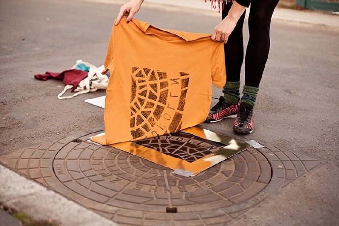 用井盖当模板印刷T恤的公司 Raubdruckerin。他们带上几把刷子和滚子,在大街上看到哪里有好看的井盖啊、带凹凸的标示等就开始刷油墨,刷好后将事先准备好的T恤啦、手提袋等棉织物等压到上面,于是一幅图案便“盗取”成功,可以出售啦~