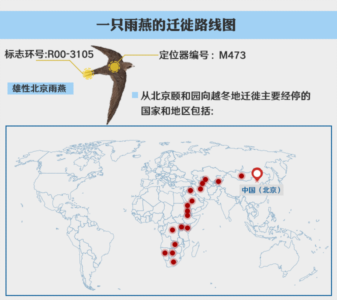 与其他的燕子一样,北京雨燕也是一种候鸟,不过,我国大多数燕子的迁徙路线是从北方到南方(也有东南亚地区),而北京雨燕比较有个性,它不向南飞,而是先向西再向南,一路从我国首都飞到南非,这个路程单程约在16000公里左右。不过,北京雨燕需要在路上休息和补充体力,并不是一下子飞1.6万公里。