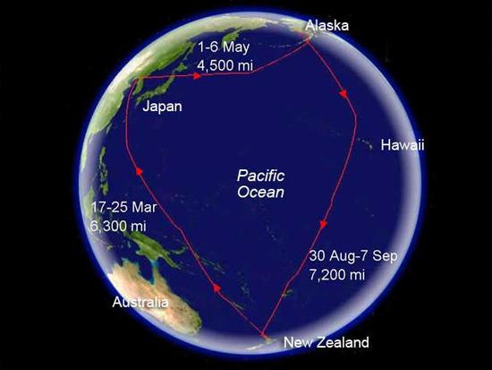 斑尾塍鹬的这一迁徙习性,是鸟类学家Gill等人通过标记从阿拉斯加出发到达新西兰的斑尾塍鹬,然后分析它们在时间和空间上的轨迹发现的。