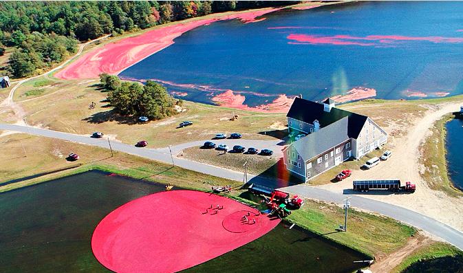 蔓越莓的收获从10月开始,为期一个月。农民有时等到果实变成深红才收获,因为果实越成熟,果汁越多,味道越醇厚。在收获湿种的蔓越莓的前一天晚上,它们都被淹没在一片汪洋中。