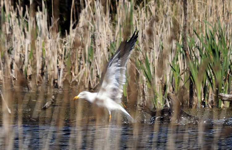 图片中,一只身形健壮的海鸥猛地扑向野鸭群,趁母野鸭不备,迅速叼起一只手无缚鸡之力的小野鸭,并准备快速逃离。