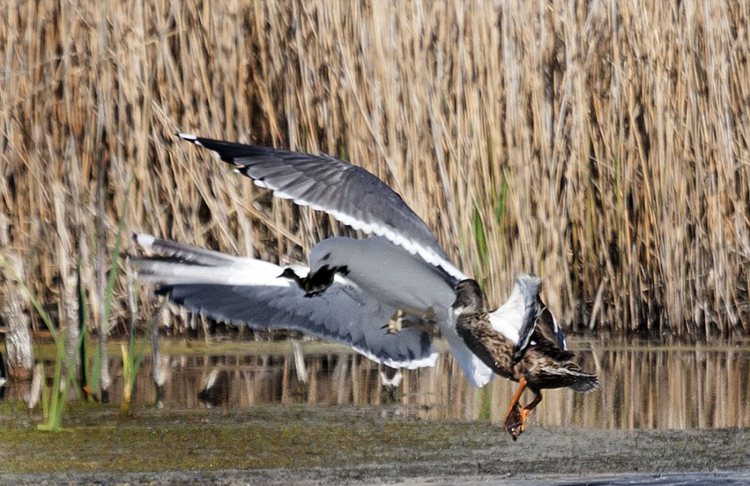 近日,摄影爱好者特里 麦肯纳(Terry McKenna)在英国剑桥郡一处私人保护区内拍摄到惊险一幕:母野鸭与海鸥低空混战,最后成功夺回小野鸭。
