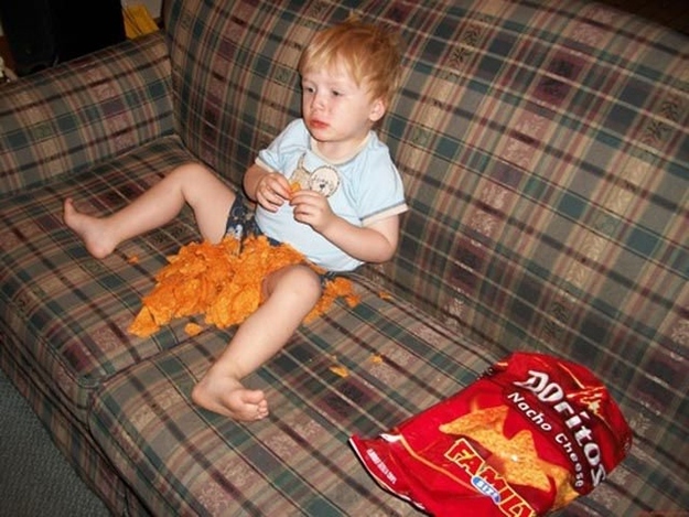 父母告诉他只能一个个拿出来吃,可他喜欢摊在沙发上捡着吃