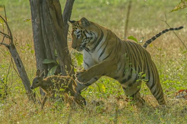 在印度马哈拉施特拉邦的老虎自然保护区,游客们相当惊异的看着这一幕,一只幼鹿漫步在有着大老虎的小路上。自然而然,每个人都变得紧张:幼鹿似乎还没有意识到危险!对大老虎而言又是一只猎物。(No!)
