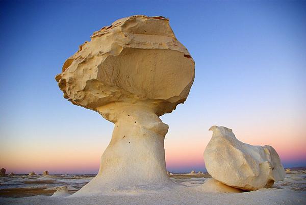 白沙漠位于埃及西部法拉法拉绿洲,受风沙风化而形成的地形,这里的沙子呈奶油一样的雪白色,和周围的黄色沙漠形成鲜明的对比。白色岩石风化而成各种形状,四处林立的鸡状石、骆驼石块、海豹石、磨菇石等等,十分有趣。而经风吹而造成的细石散布,为单调的黄沙漠,装点亮丽,不禁让人佩服大自然的神奇。在白色沙漠的夜晚观星是当地一个著名旅游节目。