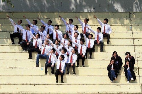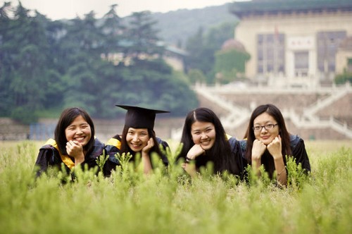 此类属于多人参与,可以选择塑胶操场的主席台、观众台,玛珈山下的篮球场边,海边的高地进行此类照片的拍摄;可以穿着学士服或正装,当然穿的休闲清新一点也是很好的。
