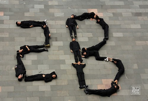 这类比较简单,但需要童鞋们为艺术献身了,对不住大家的衣服了,当然可以提前把场地打扫干净,也可摆“SB”“NB”“V5”“87”等。