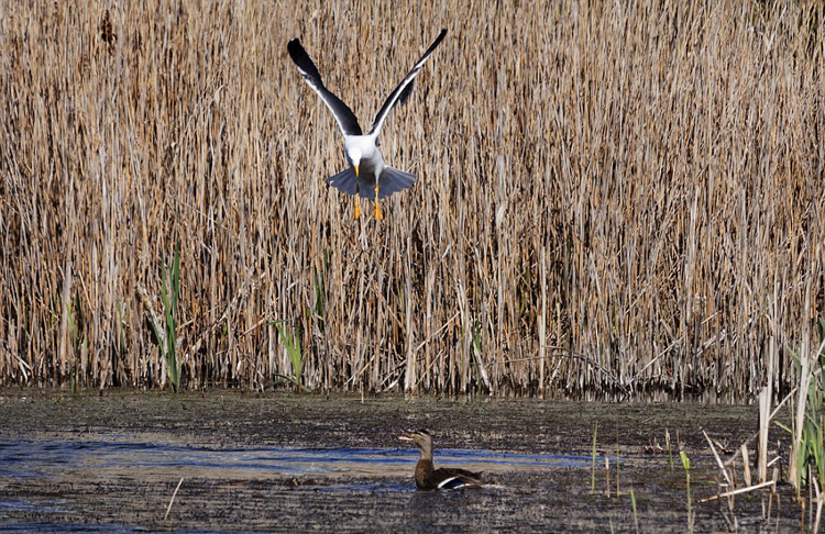 母野鸭迅速疏散其他小野鸭,猛扇翅膀穷追海鸥不舍,在低空与海鸥展开恶战。