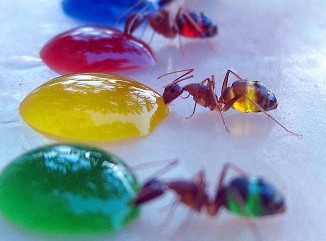 他通过混合红色,绿色,蓝色和黄色食用色素糖滴制成五彩小液滴,然后将液滴放在白色塑料片上静置于花园。蚂蚁们一刻也没有停下