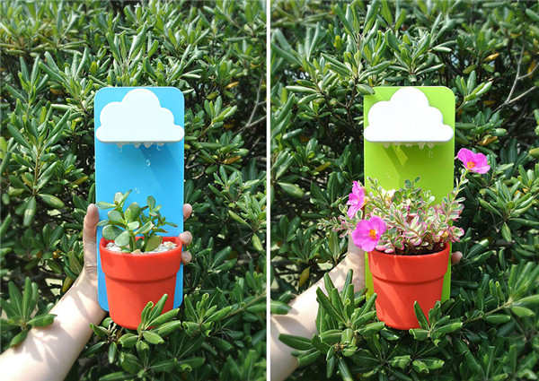 1. 这个壁挂式花盆上方有一个可爱的云状式水过滤器,这个过滤器可以把水转化成小雨滴