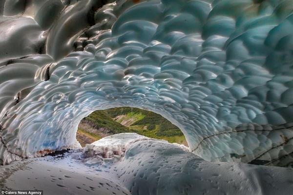 据外媒报道:耀眼的海绿色,蓝色和紫色雕刻成锯齿状的碎片,这些冰洞穴看似并不属于这个世界。