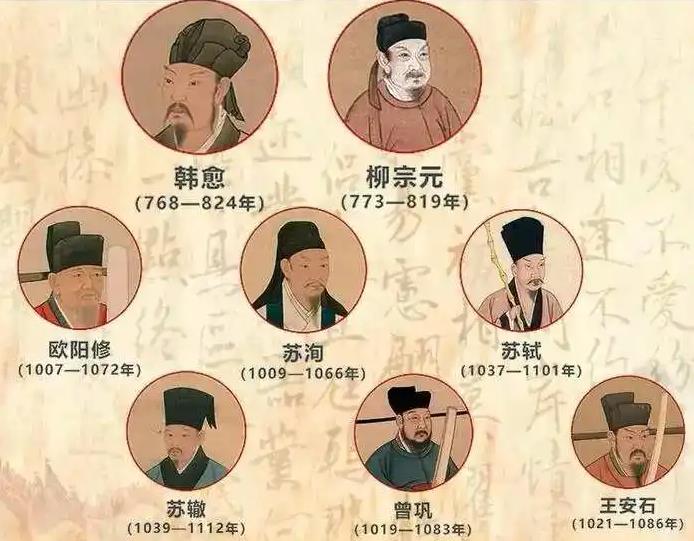 唐宋八大家是唐代和宋代总共八位散文家的合称,分别是唐代的韩愈和柳宗元;宋代的:欧阳修、三苏(苏洵、苏轼、苏辙)、曾巩、王安石,一共八位。唐代古文运动的领袖是韩愈和柳宗元,宋代古文运动的核心人物是欧阳修、苏洵、苏轼、苏辙;临川文学的代表人物是王安石和曾巩。他们将古文革新掀起浪潮,促使诗文发展焕然一新。