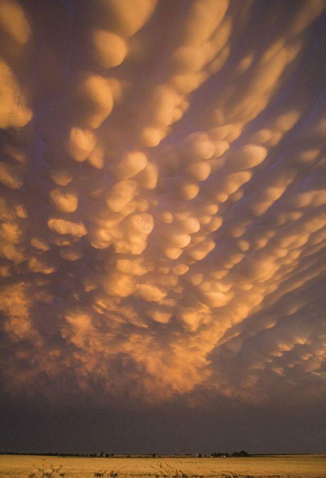 这些令人惊叹的照片展现了100英里(160公里)的长云,它看起来就像是汽泡纸覆盖了整片天空。数以百计的“泡沫球”似的云彩在风暴袭击美国之后的日落时分出现。这些壮观的泡沫形状的云彩被称为“**云”,是极其罕见的,因为只有他们处在天空低层,并且阳光充足的时候才能显现出来。