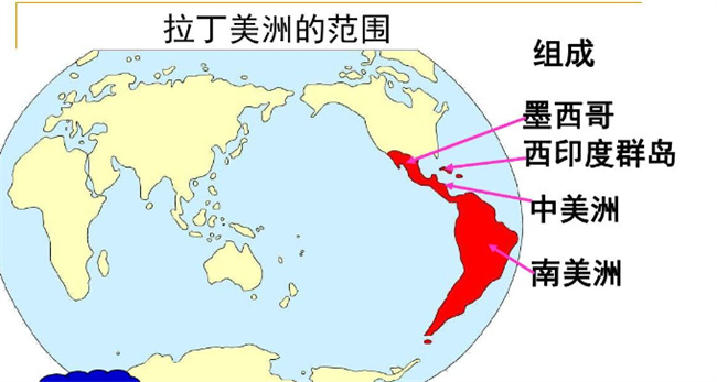 拉丁美洲这是美国以南的美洲地区,其中包括南美洲、中美洲、墨西哥以及西印度群岛。拉丁美洲西边靠近太平洋,东边靠近大西洋,北部还有加勒比海以及墨西哥湾,整体面积达到2,070万平方公里,这里的人主要是黑白混血种人以及印欧混血种人。南美洲和拉丁美洲之间主要的区别是所在地区以及所使用的语言。